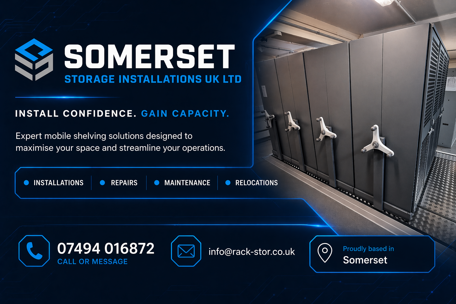 Somerset Storage Installations UK Ltd has been installing mobile shelving and roller racking systems across Somerset and neighbouring counties for over a decade. We work with offices, archives, NHS trusts, schools, museums, libraries and warehouses to deliver high-density storage that lasts.